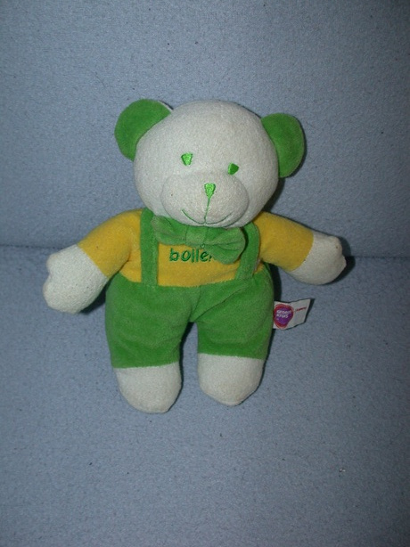 Artikelnummer: B-59 OverzichtBeer van groene, gele en witte synthetische badstof. Geborduurd gezicht en naam ‘Bolleke’ op de borst, strikje onder de kin, losse galgen die op de schouders met een steekje vasgezet zijn. Dikke rammel in het hoofd, zachte vulling. Met geweven label. Halfzittend model, lengte: 18-24 cm (kop-kruis, kop-tenen).
