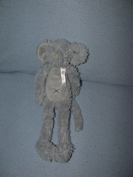 Bijzonderheden: Geborduurd gezicht en navel, donkergrijze velours neus, één oortje is een handgreep. Code PO4486 op klein labeltje