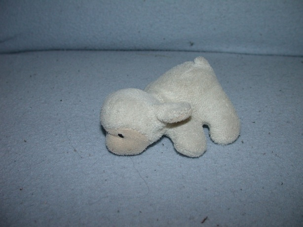 Piepklein schaapje van witte langere velours en roomkleurige snoet. Het schaapje heeft een geborduurd gezicht en alleen zachte vulling. Plat op zijn buik liggend, uitgestrekt model, lengte: 13 cm van neus tot kontje.
