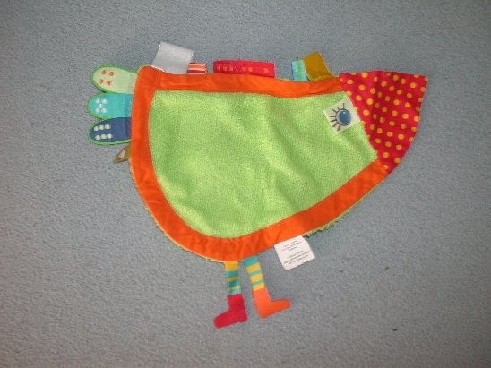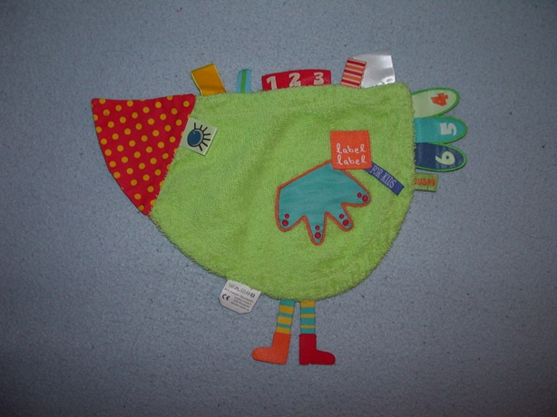 Artikelnummer: E-364 OverzichtGroen badstof doekje in de vorm van een vogel, met rood katoenen snavelgedeelte met gele stippen. Overal aan het doekje zijn extra labels te vinden. Lengte: 33 cm van snavel tot staart.
