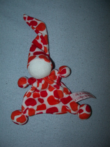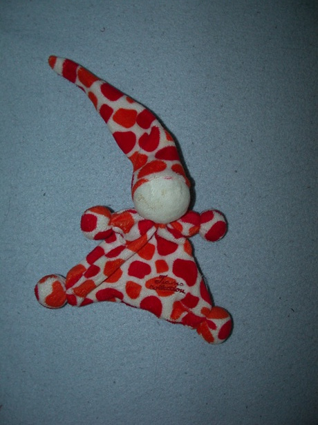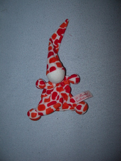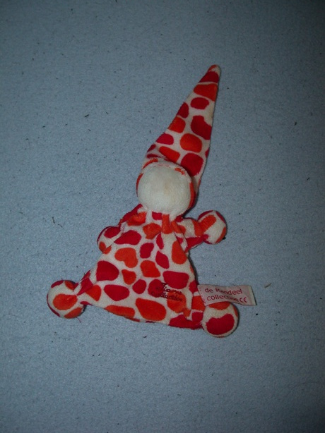 Artikelnummer: PS-722 W OverzichtTutpopje van witte langere velours met oranje en rode vlekken. Hoofd, handen en voeten zijn stevig gevulde bolletjes, lijf en puntmuts zijn ongevuld. Lengte: 14-26 cm (kop-kruis, muts-kruis). In hele nette staat.