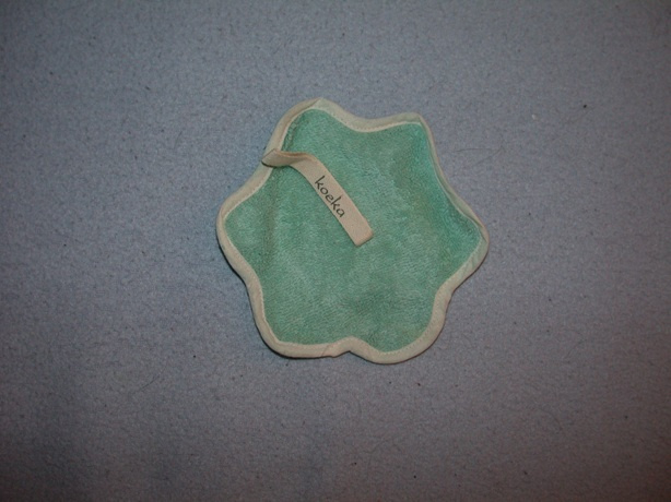 Speendoekje in golvend model met zes punten, van lichtblauwe badstof en afgezet met wit katoenen biaisband. In het midden een lange geweven band om de speen aan vast te maken, met de naam 'Koeka' erop. Afmeting van punt tot punt:…